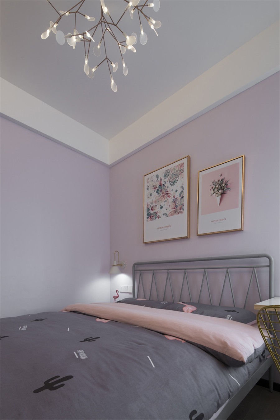 不同于主臥的素雅,少女心滿滿的女兒房, 床頭掛畫,鐵藝床與火烈鳥床單,INS風十足。