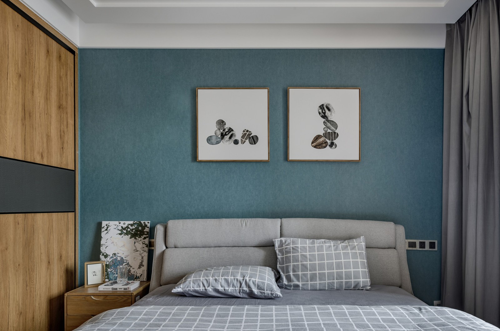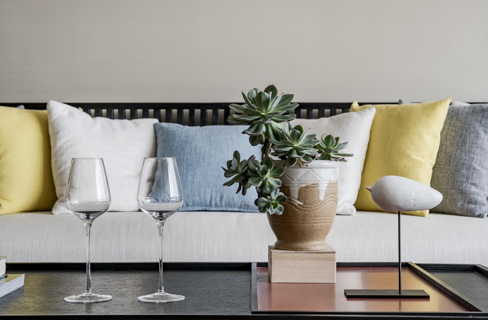 沙發(fā)背景墻珍珠白乳膠漆,新中式特有的落地?zé)簦?jiǎn)單的一副山水掛畫(huà)就能體現(xiàn)業(yè)主的品味。